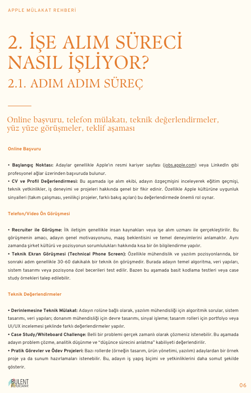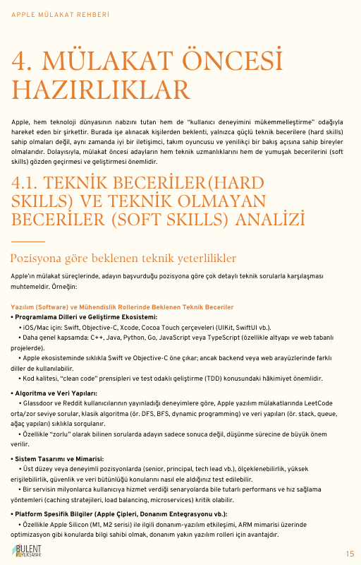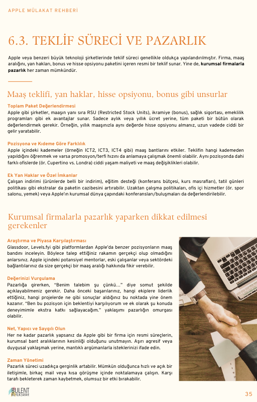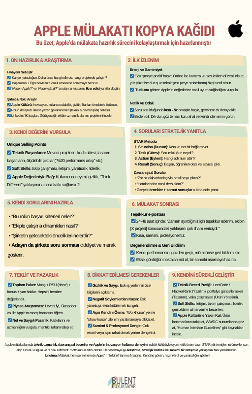 Apple’da işe girme hayalinizi gerçeğe dönüştürmek için hazırlanan bu 50 sayfalık dev rehber, size STAR metodu ile etkili yanıtlar oluşturmayı, Apple’ın kültürüne uyumlu stratejiler geliştirmeyi ve teklif pazarlığı yaparken fark yaratmayı öğretir. Gerçek sorular, somut örnekler ve adım adım rehberlik ile mülakat sürecinde öne çıkmak isteyenler için vazgeçilmez bir kaynak!