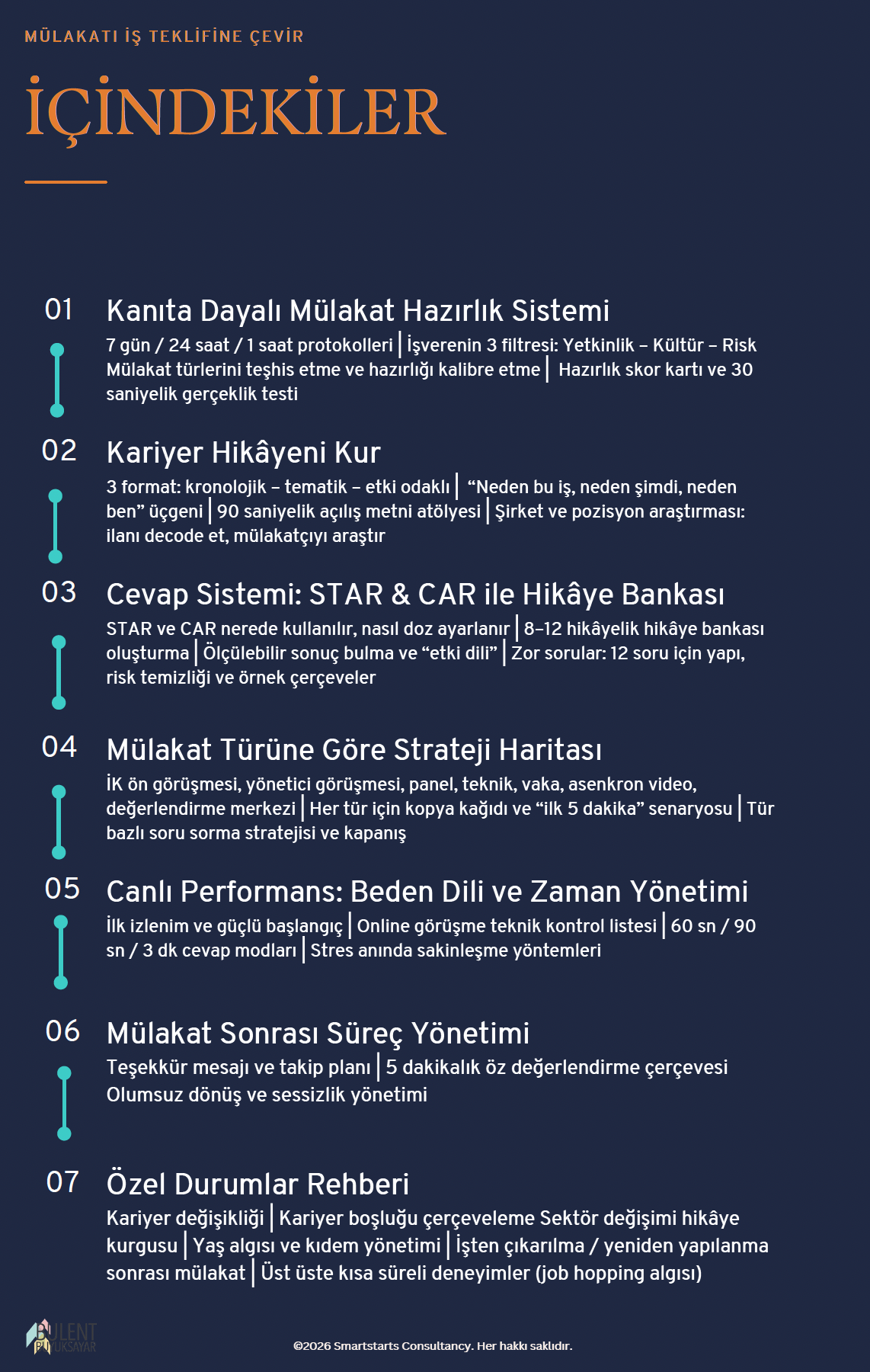 Mülakata 7 gün mü kaldı, 24 saat mi, 90 dakika mı? Fark etmez. Her zaman dilimi için ayrı hazırlık protokolü var. İşverenin gerçek karar mantığını öğreneceksin: yetkinlik, kültür uyumu ve risk filtreleri. Hazırlık skor kartıyla kendini ölçecek, 30 saniyelik gerçeklik testiyle "hazır mıyım" sorusunu somutlaştıracaksın. Artık "hazır hissediyorum" değil, "hazırım" diyeceksin.